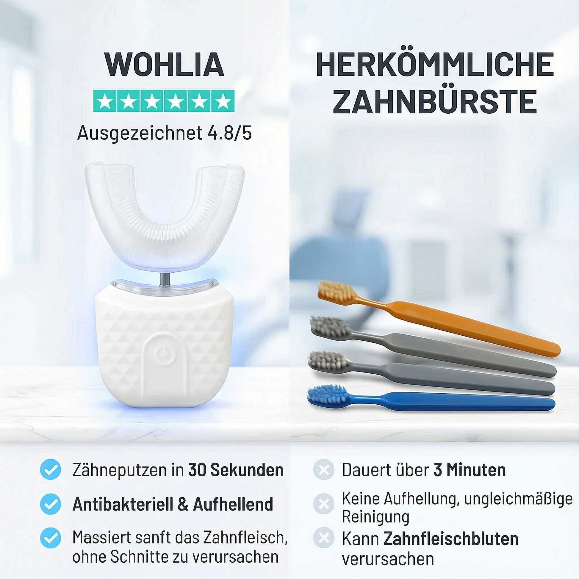 Genau dafür wurde die Wohlia™ U-förmige automatische Zahnbürste entwickelt – um die Zahnpflege für Zahnspangenträger einfacher, sanfter und gleichzeitig effektiv zu machen.
